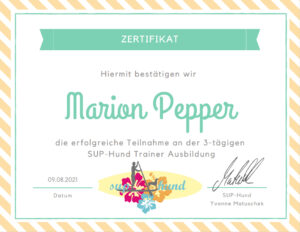 Marion Pepper ist ausgebildeter ACA SUP Instructor Level 2 (höchste Flachwasser Level der ACA) und zudem zertifizierte SUP-Hund Trainerin. Diese umfangreiche Ausbildung hebt die Hundeschule Pepper aus der Masse an Angeboten im SUP-Hundebereich heraus. In der Sommersaison 2021 und 2022 war sie zudem für SUP-Trip in Potsdam als SUP-Instructor (Trainerin) u.a. für Kurse und Einzeltraining, Geburtstagsevents und Co-Trainer bei der Ausbildung neuer SUP-Instruktoren tätig.